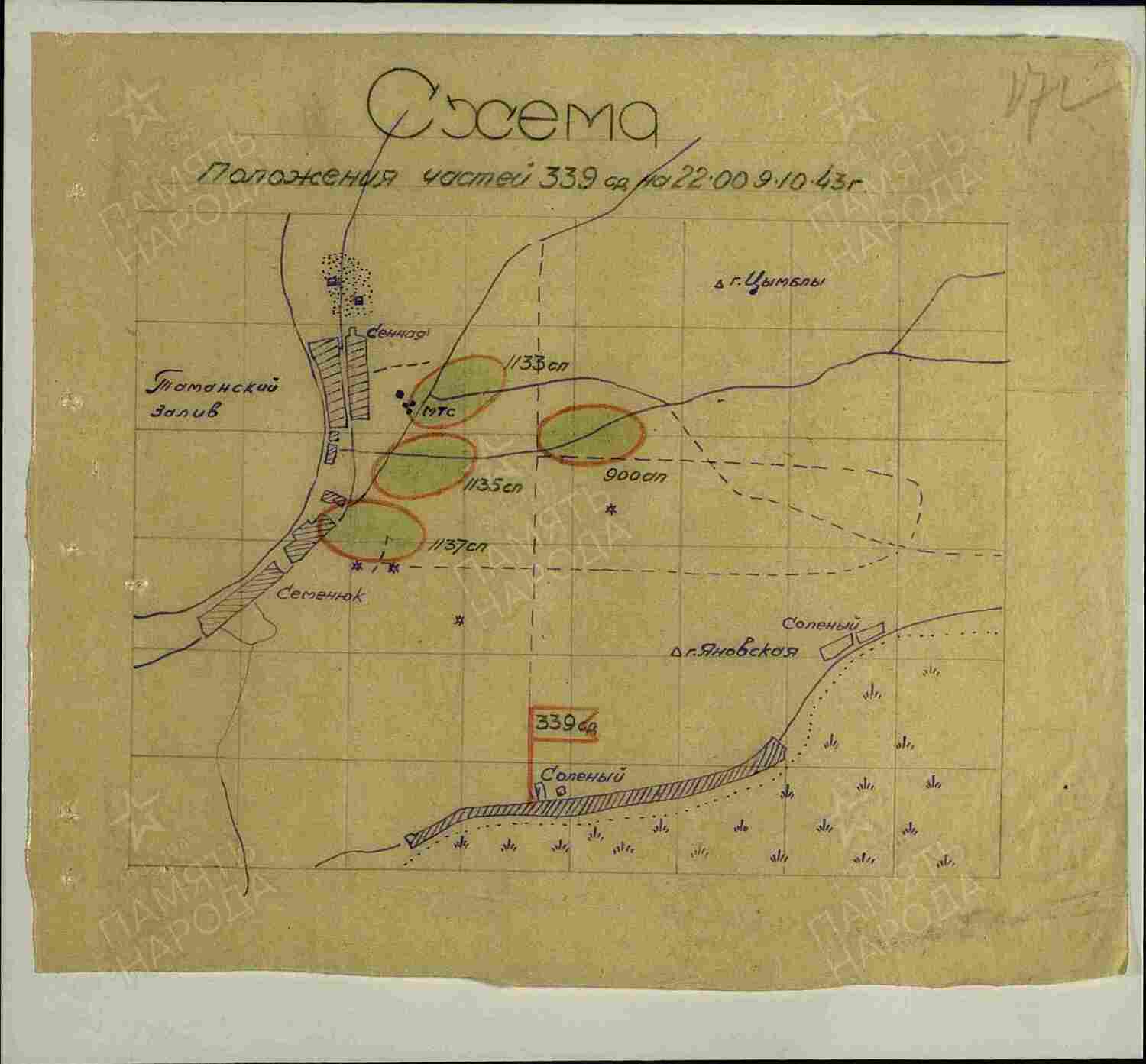 Схема положения частей 339 стрелковой дивизии на 09.10.1943 г. (ЦАМО, ф.1656, оп.1. д.72, л.172)