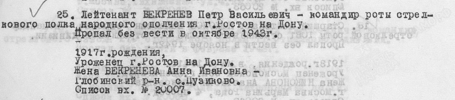 Исходя из Приказа об исключении из списков, а также учетно-послужной картотеки ЦАМО, Петр Бекренев пропал без вести в октябре 1943 года.