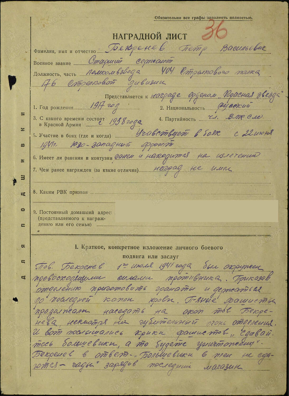 Наградной лист (ЦАМО, ф.33, оп.682524, д.484, л.36-36об.)