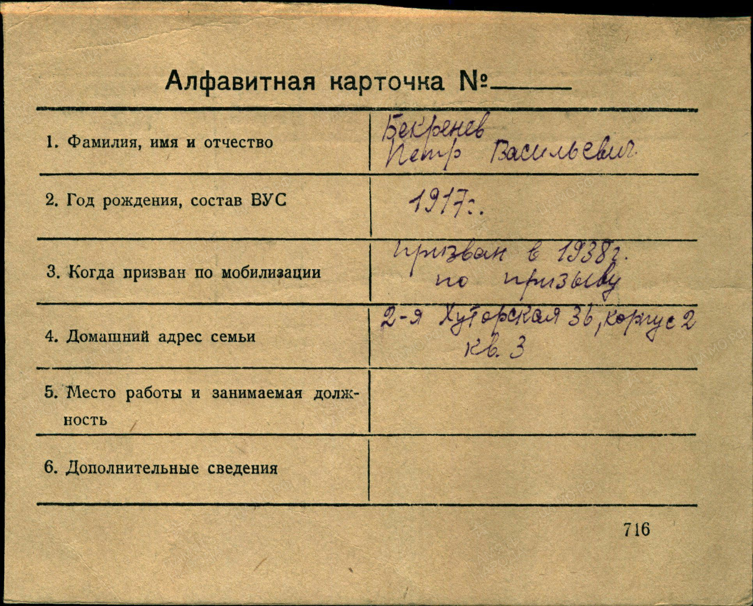Карточка военно-пересыльного пункта 1938 года (Тверской ОВК, Москва)