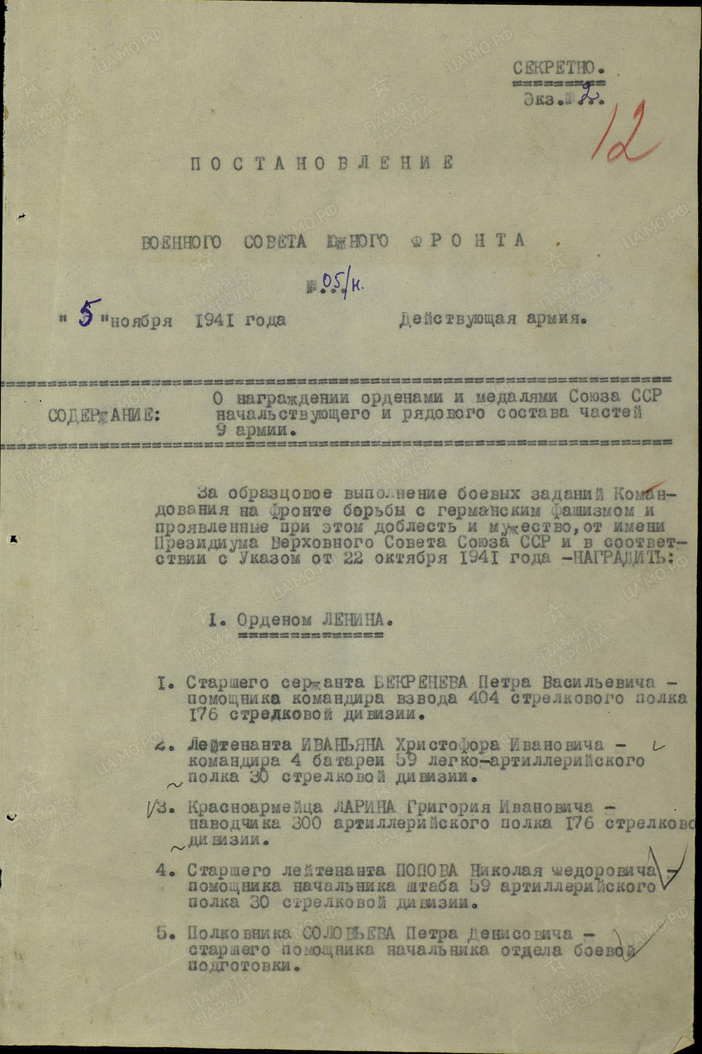 Приказ о награждении (ЦАМО, ф.33, оп.682524, д.484, л.12)