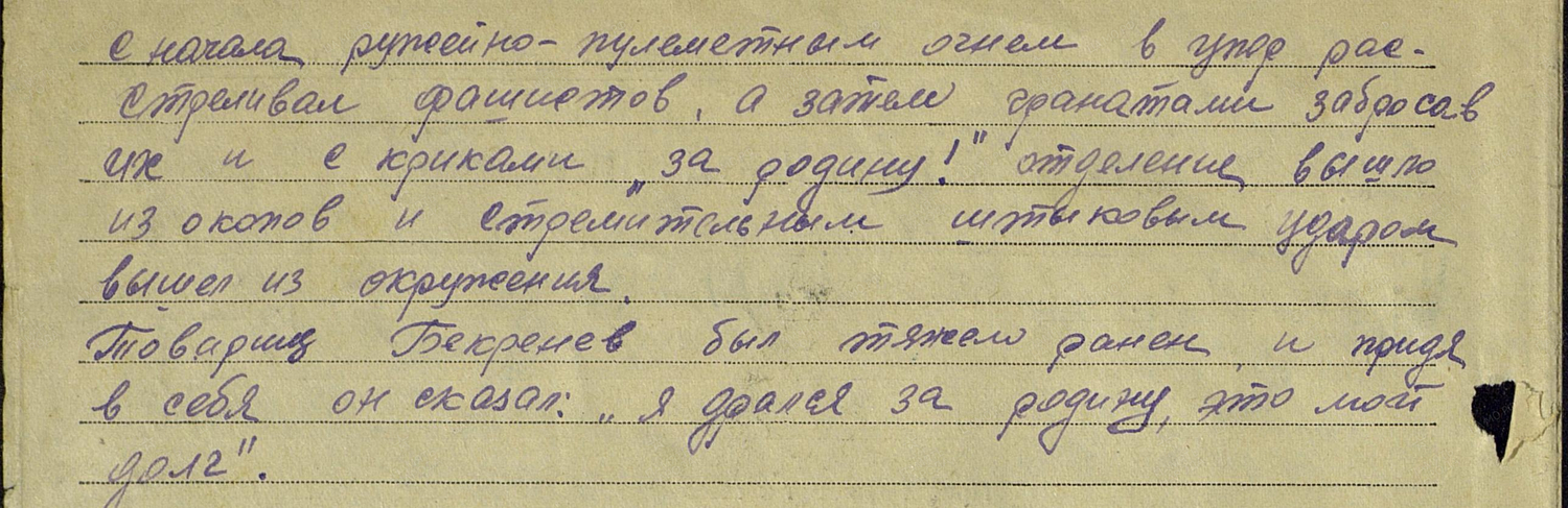 «... Тов. Бекренев 1-го июля 1941 года был окружен превосходящими силами противника. Приказав отделению приготовить гранаты и держаться до последней капли крови. П-яные фашисты продолжали наседать на окоп тов. Бекренева, несмотря на губительный огонь отделения. И вот послышались крики фашистов: «Сдавайтесь большевики, а то будете уничтожены». Бекренев в ответ – «Большевики в плен не сдаются – гады». Зарядив последний магазин с начала ружейно-пулеметного огня в упор расстреливал фашистов, а затем гранатами забросав их, и с криками «За родину!» отделение вышло из окопов и стремительным штыковым ударом вышел из окружения. Товарищ Бекренев был тяжело ранен и придя в себя он сказал: «Я дрался за родину, это мой долг ...» (ЦАМО, ф.33, оп.682524, д.484, л.36-36об.).