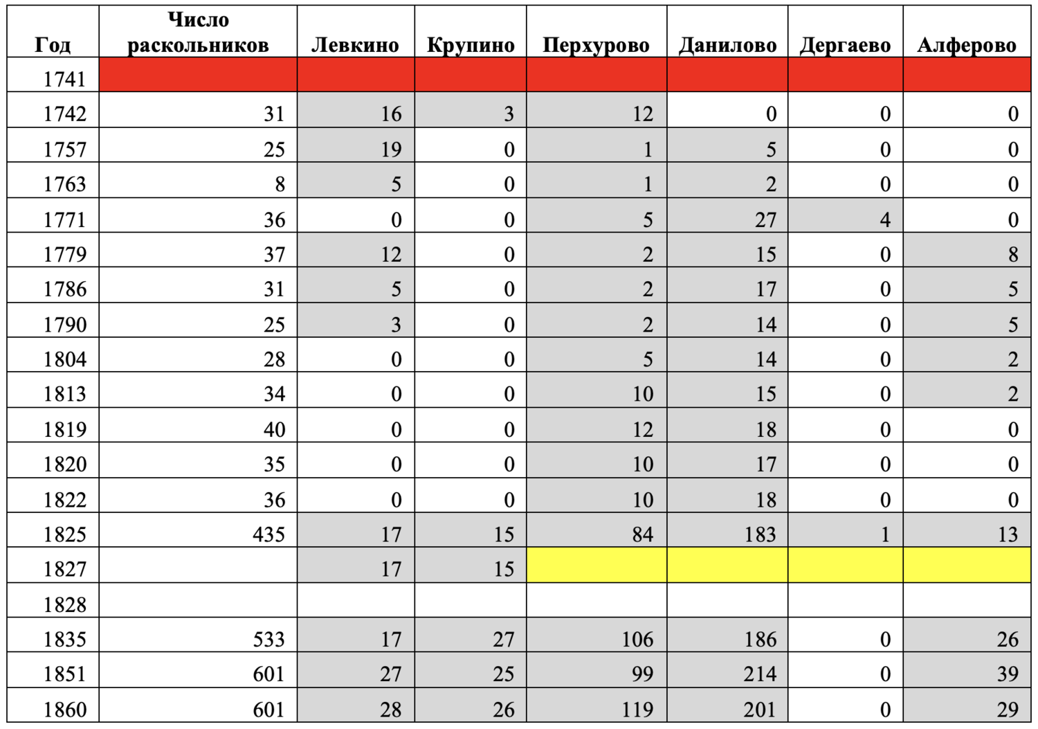 Динамика численности раскольников в деревнях волости Загарье в период 1742-1860 гг.