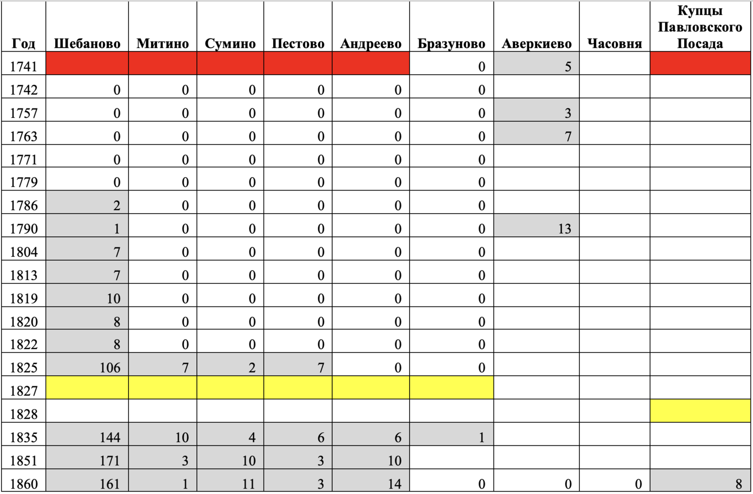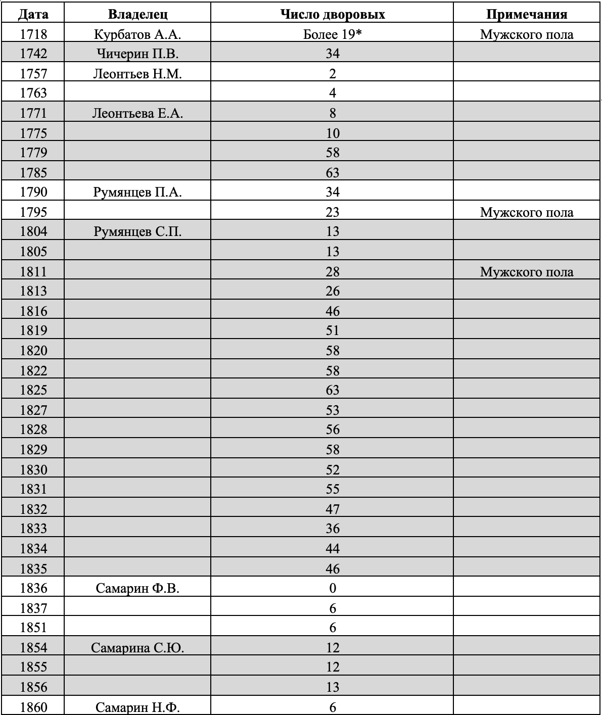 Число дворовых оценивалось по числу выбывших (умершие, бежавшие) после первой ревизии 1718 года по данным второй ревизии 1744 года